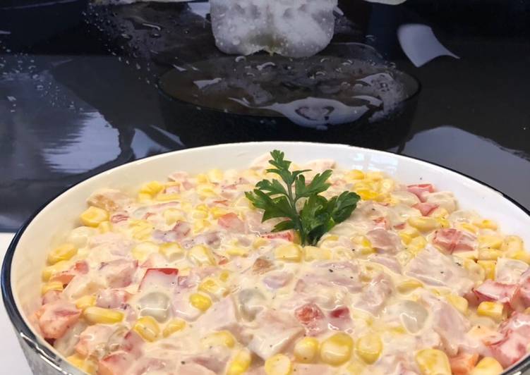 - Mięsko i paprykę pokroić w kostkę dodać do miski. Następnie dodać odsączoną kukurydzę i cebulkę, dodać sól i pieprz do smaku. Całość wymieszać z majonezem..