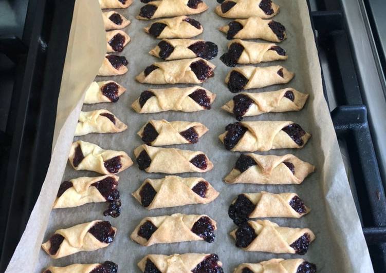- Mąkę posiekać z margaryna, dodać jaja, posiekać, dodać śmietanę. Posiekać a następnie wyrobić rękami. Ciasto rozwałkować, kroić kwadraty i nadziewać marmoladą. Ciasteczka piec, aż się zrumienią😀..
