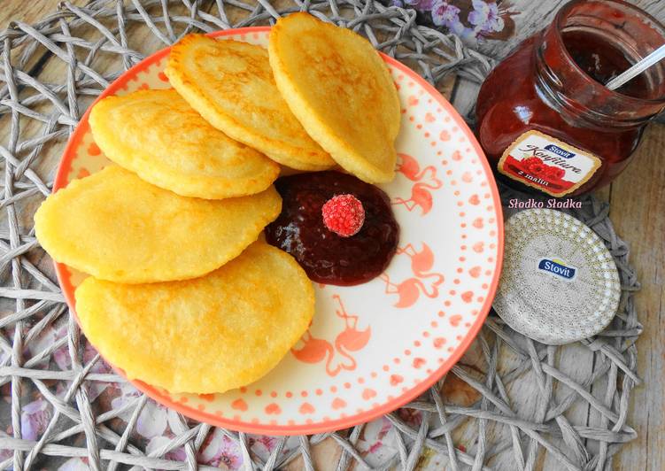 - Smażyć na oleju,na średnim ogniu z obu stron na rumiano.Podawać z ulubioną konfiturą,dżemem,lub posypane cukrem pudrem..