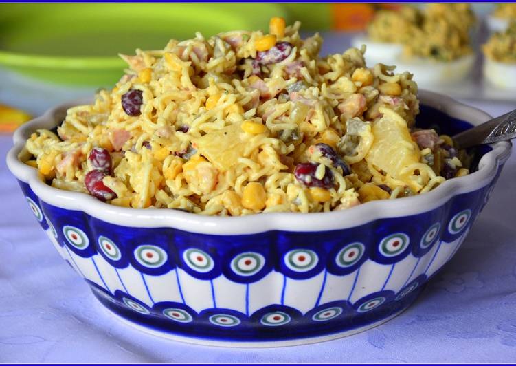 - Makaron z zupek pokruszyć, posypać przyprawami i zalać niewielką ilością wrzątku, tyle aby makaron zmiękł. Dodać osączoną kukurydzę i fasolkę, pokrojonego ananasa. Nogi z kurczaka obrać ze skóry i kości i drobno pokroić, dodać do makaronu. Ogórki pokroić i odcisnąć, dodać do sałatki. Całość wymieszać z makaronem. Smacznego :).