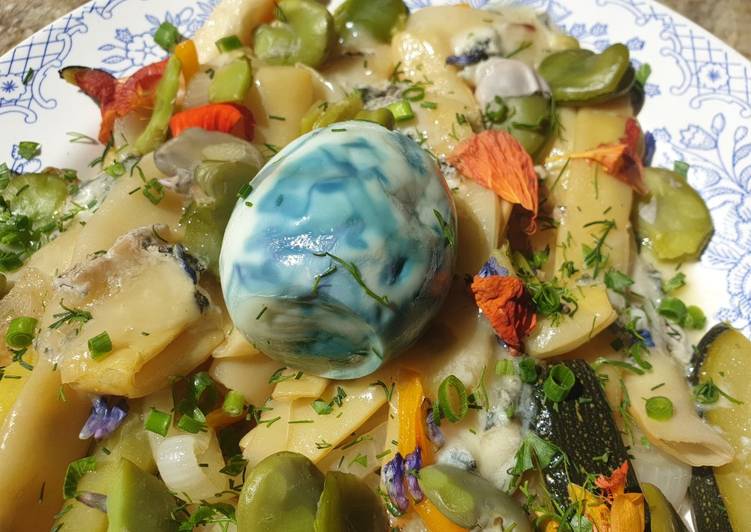 - Warzywa umyć. Ugotować na parze. Cebulę zamarynować z niebieskimi kwiatami. Ser pokroić w drobna kostkę..