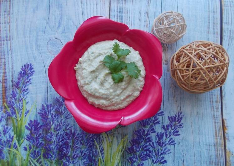 - Bób gotujemy do miękkości w osolonej wodzie, studzimy i obieramy. Pierś z kurczaka opłukujemy, osuszamy i nacieramy solą oraz pieprzem. Mięso gotujemy w wodzie do miękkości i studzimy. Następnie pierś z kurczaka drobno kroimy i przekładamy do kielicha blendera. Do pokrojonego mięsa dodajemy ugotowany bób, posiekaną kolendrę, masło oraz wlewamy bulion. Blendujemy na gładką pastę. Doprawiamy do smaku..