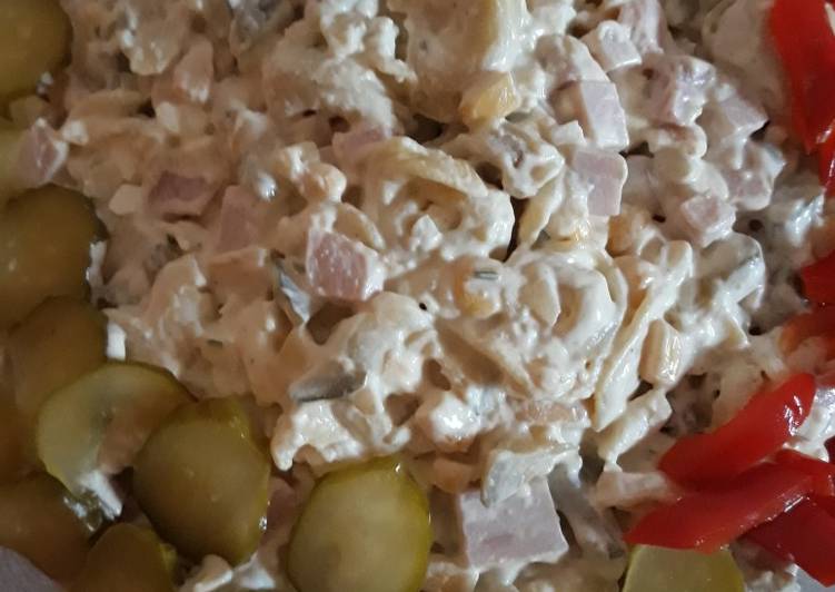 - Makaron i jajka ugotować. Jajka, szynkę pokroić w kostkę. Ogórki pokroić w pół księżyce. Wszystkie składniki połączyć razem dodać pietruszkę i doprawić do smaku. Wymieszać z majorem. Smacznego 😊.