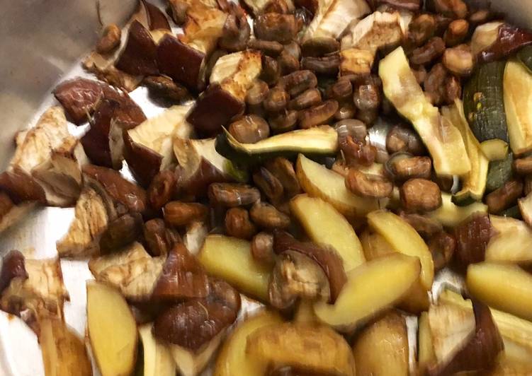 - Bakłażany i cukinie myjemy i kroimy na długie kawałki. Ziemniaki myjemy i kroimy w ósemki.na blachę wykładamy warzywa i umyty bób. W miseczce mieszamy oliwę z przyprawami. Polewamy warzywa i obtaczamy je w oliwie. Pieczemy w piekarniku około 1 godziny w temp. 180 stopni (góra dół). Smacznego!.