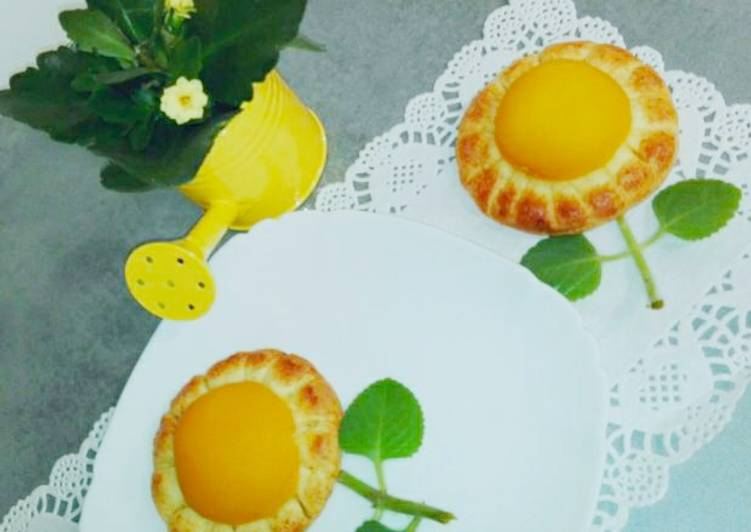 - Rozwałkować przygotowane ciasto na podsypanej mąką stolnicy na grubość ok 1 cm. Wykrawać za pomocą dużego kubka krążki. Na każdym krążku na środku ułożyć po połówce brzoskwini. Ponacinać brzegi ciasta wokół brzoskwini tak, aby powstały płatki słonecznika..