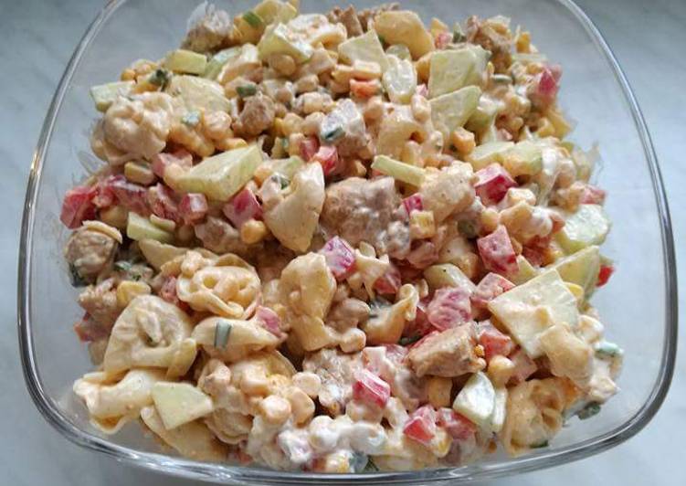 - Makaron ugotować wg przepisu na opakowaniu. Filety pokroić w kostkę, doprawić przyprawą do kurczaka, usmażyć. Ogórek i paprykę pokroić w kostkę. Dodać kukurydzę. Czosnek przecisnąć przez praskę, szczypiorek posiekać. Wymieszać z majonezem. Połączyć wszystkie składniki i doprawić..