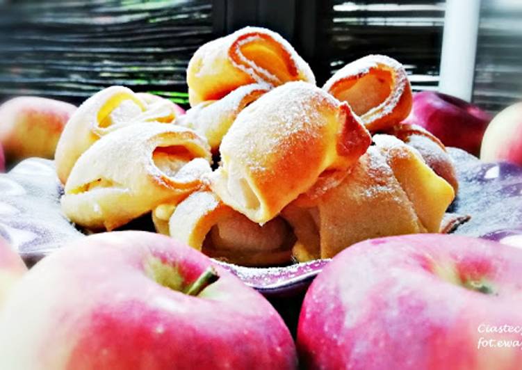 - Jabłka obrać, usunąć gniazda nasienne i pokroić na ćwiartki. Za pomocą robota z nożami do siekania połączyć składniki ciasta. Ciasto wyjąć z misy uformować kulę i przekroić ją na 2 części. Każdą wałkować na koło i przeciąć na 16 kawałków (trójkątów). Na końcu szerszej strony ciasta kłaść ćwiartki jabłek i zwijać jak rogaliki. Ciastka kłaść na blachach wyłożonych papierem do pieczenia..