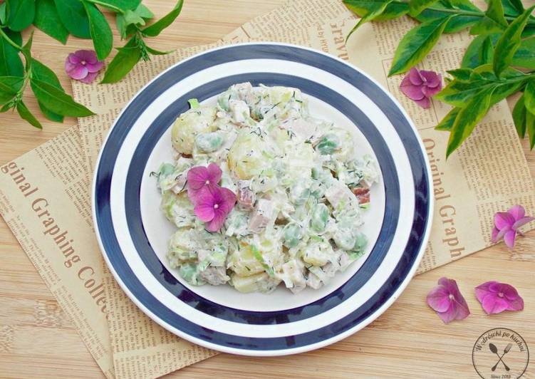 - Bób gotujemy w lekko osolonej wodzie przez 4-5 minut i odcedzamy. Ziemniaki zalewamy zimną wodą, dodajemy sól i gotujemy. Kiedy ziemniaki będą już miękkie, odcedzamy i odstawiamy do wystudzenia. W tym czasie pory przecinamy wzdłuż na pół, następnie kroimy w cienkie półplasterki. Szynkę kroimy w słupki. Przestudzone ziemniaki obieramy, większe ziemniaki kroimy na pół. Wszystkie składniki przekładamy do jednej miski..
