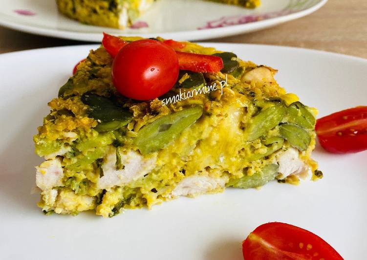 - Maślankę wymieszać z jajkami i przyprawami, dodać otręby i odstawić na około 10 minut. Następnie dodać bób, kurczaka, ser, czosnek przeciśnięty przez praskę i drobno posiekaną kolendrę i wszystko dokładnie wymieszać. Przełożyć do formy (najlepiej silikonowej) i piec w piekarniku nagrzanym do 180 stopni przez około 35-40 minut..