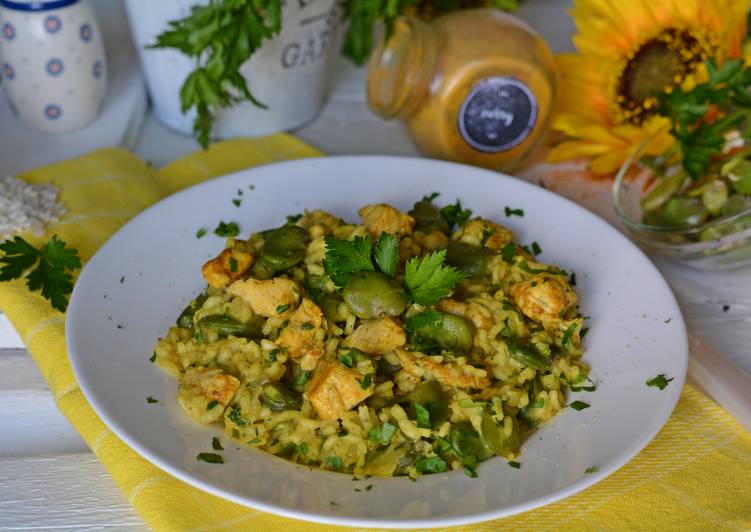 Risotto z bobem i kurczakiem. Risotto danie, którego dawno już u nas w domu nie było. Ale jako, że jest w miarę szybkie w przygotowaniu i pyszne, zrobiłam je ostatnio w czasie leniwego sobotniego popołudnia. Risotto Z Pieczarkami I Piersią Z Kurczaka.