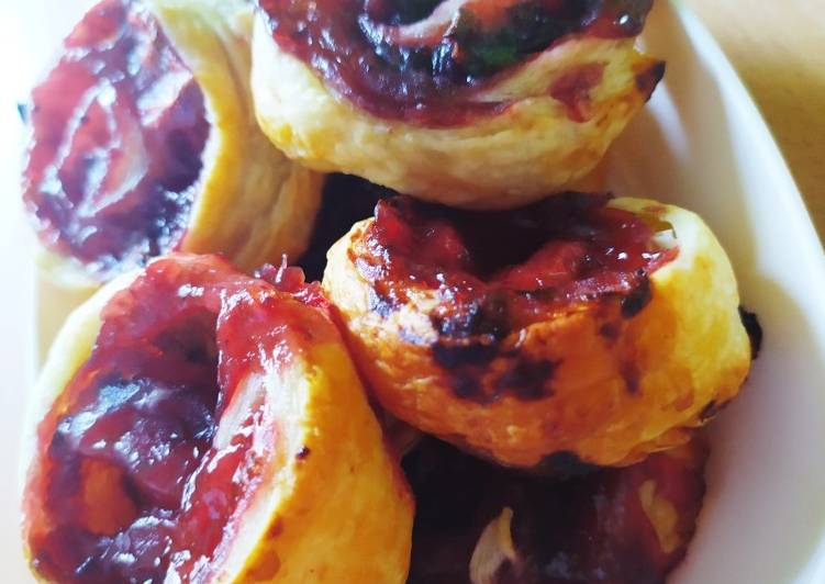 - Na rozłożone ciasto francuskie rozsmaruj dowolne nadzienie. Zwiń w rulon i pokrój na 2-3cm kawałki. Połóż na blaszce wyłożonej papierem do pieczenia, posmaruj jajkiem lub mlekiem. Piecz w temperaturze 200 stopni około 20min. :).