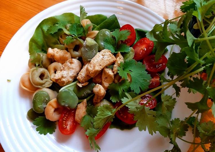 - Ugotowany bób obrać delikatnie, że skórki. Makaron wyłożyć na talerz, dodać kurczaka, bób, pomidorki pokrojone na pół. To wszystkiego dodać liście świeżej kolendry..